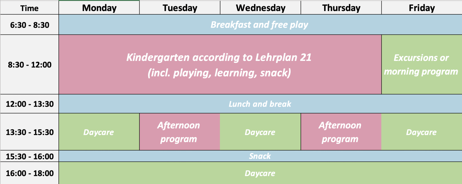 | CHF 2’125* | Basic | 4 days of kindergarden per week and per month (12 times per year) from 6:30 AM to 6:00 PM, Monday - Thursday |